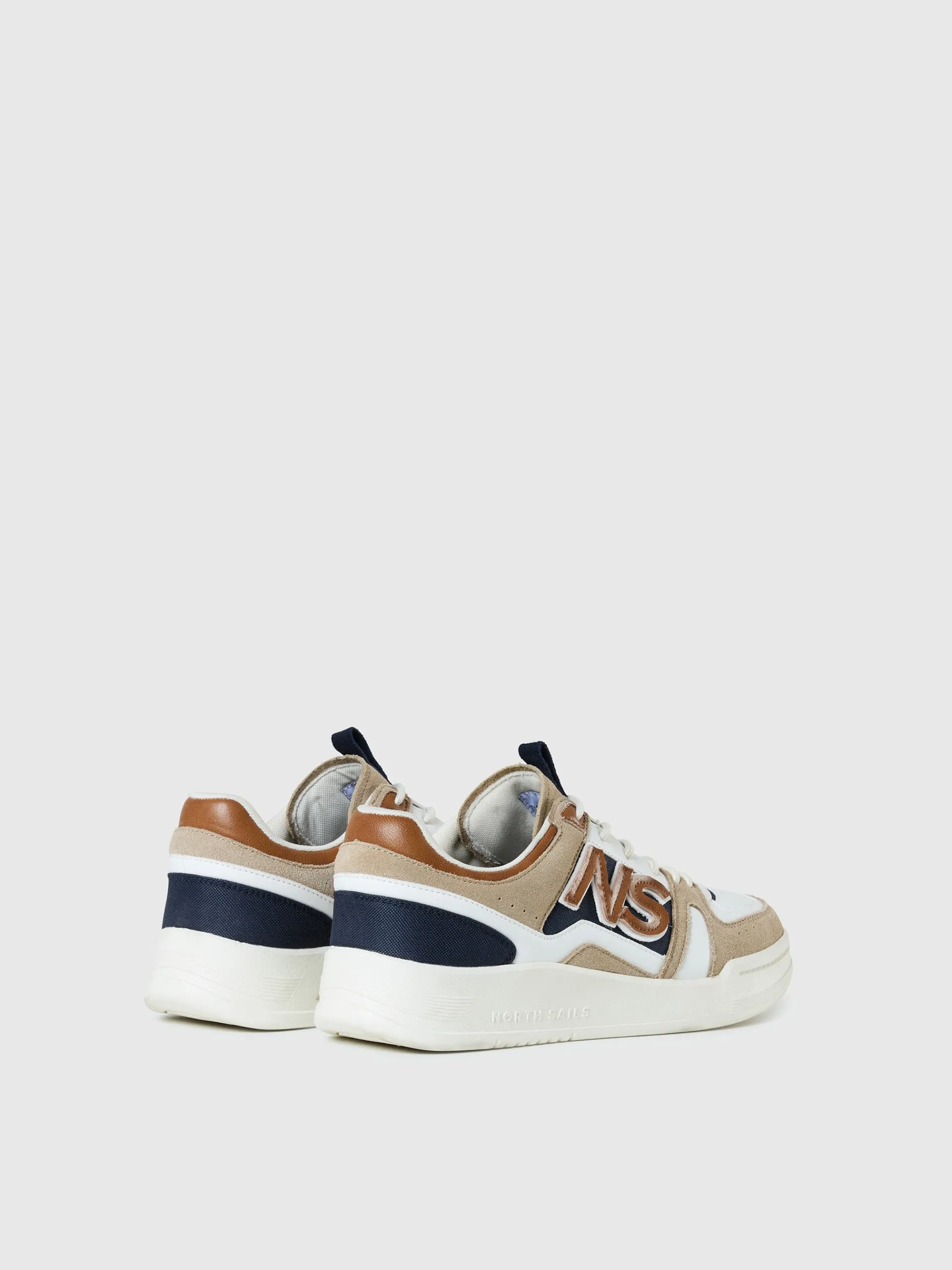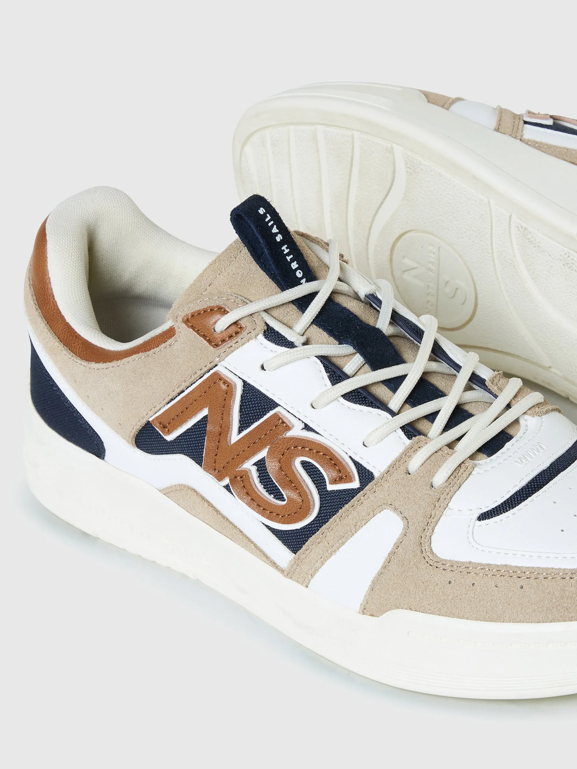 A timeless tennis design, but with distinctive North Sails attitude. Flaunting a layered construction in three refined tones, this sneaker is embellished with delicately stitched precision-cut NS initials on the side. Finished with tubular laces, a branded pull tab on the tongue and a robust rubber sole.